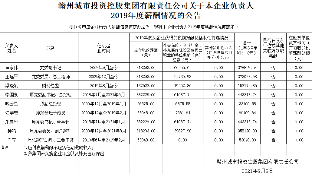 贛州城市投資控股集團有限責任公司關于本企業(yè)負責人2019年度薪酬情況的公告