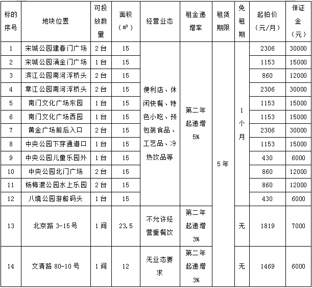 以上清單內容僅供參考,以現(xiàn)狀交付,拍賣公司和委托人不承擔瑕疵擔保責任,其中標的1-標的12僅提供場地,競得人負責花車經營設備投資、日常經營(包括經營秩序、場地保潔、垃圾清運、污水廢水處理)。