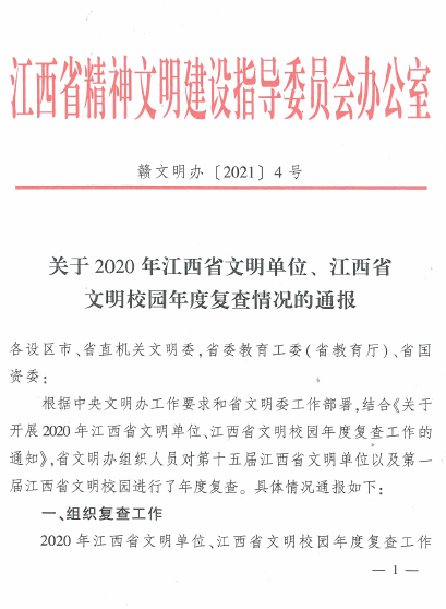近日,江西省文明辦印發(fā)《關(guān)于2020年江西省文明單位、江西省文明校園年度復(fù)查情況的通報(bào)》(贛文明辦[2021]4號(hào)),贛州城投集團(tuán)順利通過(guò)2020年省級(jí)文明單位年度復(fù)查,繼續(xù)保留“第十五屆江西省文明單位”稱(chēng)號(hào)。