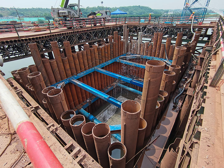 蟠龍大橋主橋涉水施工措施是技術難點、重要性節(jié)點、施工危險性較大工程之一,主要技術難點在于水中墩柱承臺的圍堰施工,針對薄覆蓋層硬質(zhì)河床、承臺入巖等水文地質(zhì)、設計要求,工程管理公司黨總支在蟠龍大橋項目成立黨員先鋒隊攻堅小組,精心組織、知難而上、勇于探索,在水中P17#、P18#墩采用了“成套鎖扣鋼管樁(φ630)+全套管全回轉(zhuǎn)鉆引孔開槽+清槽嵌固+封底”的圍堰方案,成功破解了項目建設中,水中薄覆蓋層硬質(zhì)河床引孔開槽、鋼管樁搭設鎖扣、反循環(huán)清槽、細石混凝土封槽、鎖扣止水等技術難點。