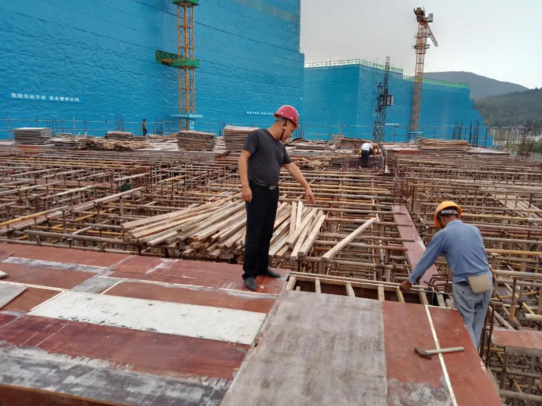 在中國科學(xué)院贛江創(chuàng)新研究院一期新建項目,工程管理公司項目經(jīng)理在項目施工現(xiàn)場指導(dǎo)木工作業(yè)。