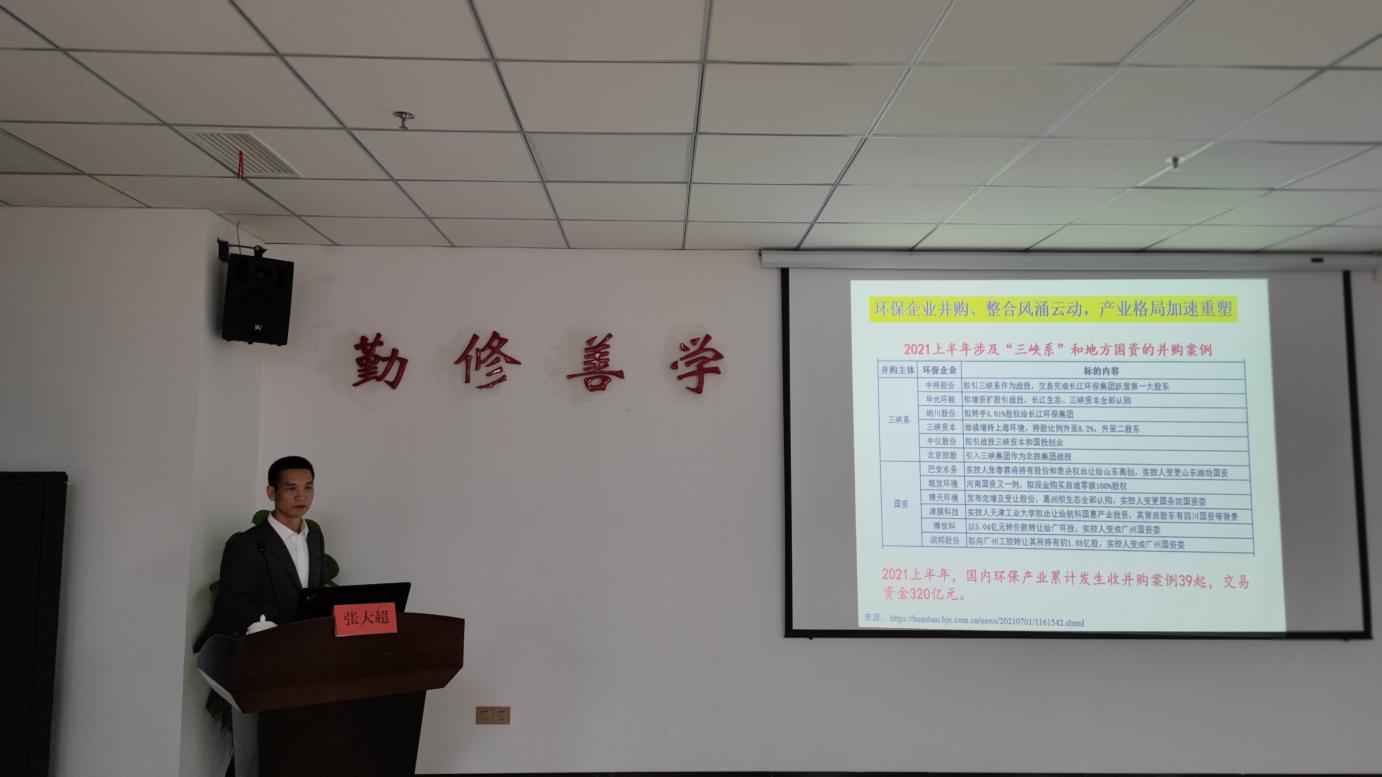 張教授詳細(xì)闡述了目前國內(nèi)環(huán)保產(chǎn)業(yè)發(fā)展態(tài)勢,從環(huán)保產(chǎn)業(yè)方向、集聚區(qū)域、企業(yè)規(guī)模等方面指出了國有企業(yè)在環(huán)保產(chǎn)業(yè)領(lǐng)域的優(yōu)勢與劣勢,為集團生態(tài)板塊發(fā)展提出深耕精細(xì)化、系統(tǒng)化運營等建設(shè)性建議。期間,參訓(xùn)人員還與張教授就贛州市域農(nóng)村生活污水處理工藝及市場發(fā)展?fàn)顩r進行了深入的探討與交流。