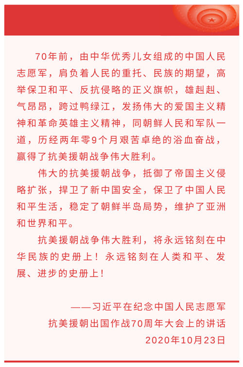 1950年10月8日,毛澤東發(fā)布命令,組建以彭德懷為司令員兼政治委員的中國(guó)人民志愿軍。19日,志愿軍雄赳赳氣昂昂跨過(guò)鴨綠江。這是以正義之師行正義之舉。中國(guó)人民志愿軍同朝鮮軍民密切配合,首戰(zhàn)兩水洞、激戰(zhàn)云山城,會(huì)戰(zhàn)清川江、鏖戰(zhàn)長(zhǎng)津湖等,此后又構(gòu)筑起銅墻鐵壁般的縱深防御陣地,實(shí)施多次進(jìn)攻戰(zhàn)役,粉碎“絞殺戰(zhàn)”、抵御“細(xì)菌戰(zhàn)”、血戰(zhàn)上甘嶺,創(chuàng)造了威武雄壯的戰(zhàn)爭(zhēng)偉業(yè)。