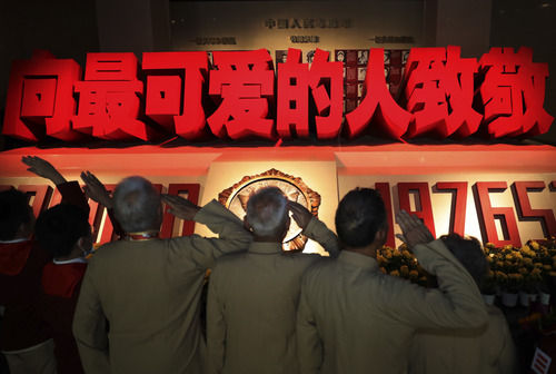 △2020年9月19日,在抗美援朝紀(jì)念館英烈廳,志愿軍老戰(zhàn)士和少先隊(duì)員向犧牲的烈士致敬。新華社記者 楊青 攝